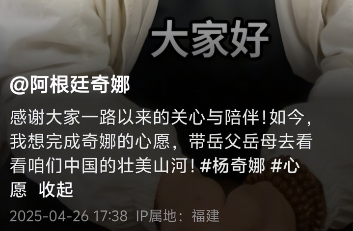 2025年4月27日,福建长汀的街头巷尾都在谈论一个令人唏嘘的消息。38岁的阿根廷媳妇杨奇娜因突发低血糖在家中离世,这个说着流利客家话、被当地人亲切称为"长汀女儿"的外国媳妇,19年的异国生活就此画上句点。更令人意外的是,葬礼后第三天,丈夫杨淙带着刚失去女儿的阿根廷岳父母游览长城的照片在网上流传,引发轩然大波。